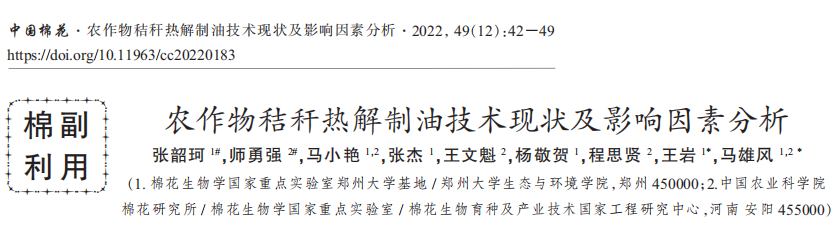 新疆是我国棉花种植面积最大的地区,随之孕育发作的秸秆废除物从事问题,成为新疆棉耗费费面临的弘大经济问题。生物量的热解是生物量开发操做最有前景的财产,其产物生物油具有易储存、污染小且易运输等劣点。因而,将棉秆做为生物量热解的本资料,可为棉秆从事问题供给新思路。